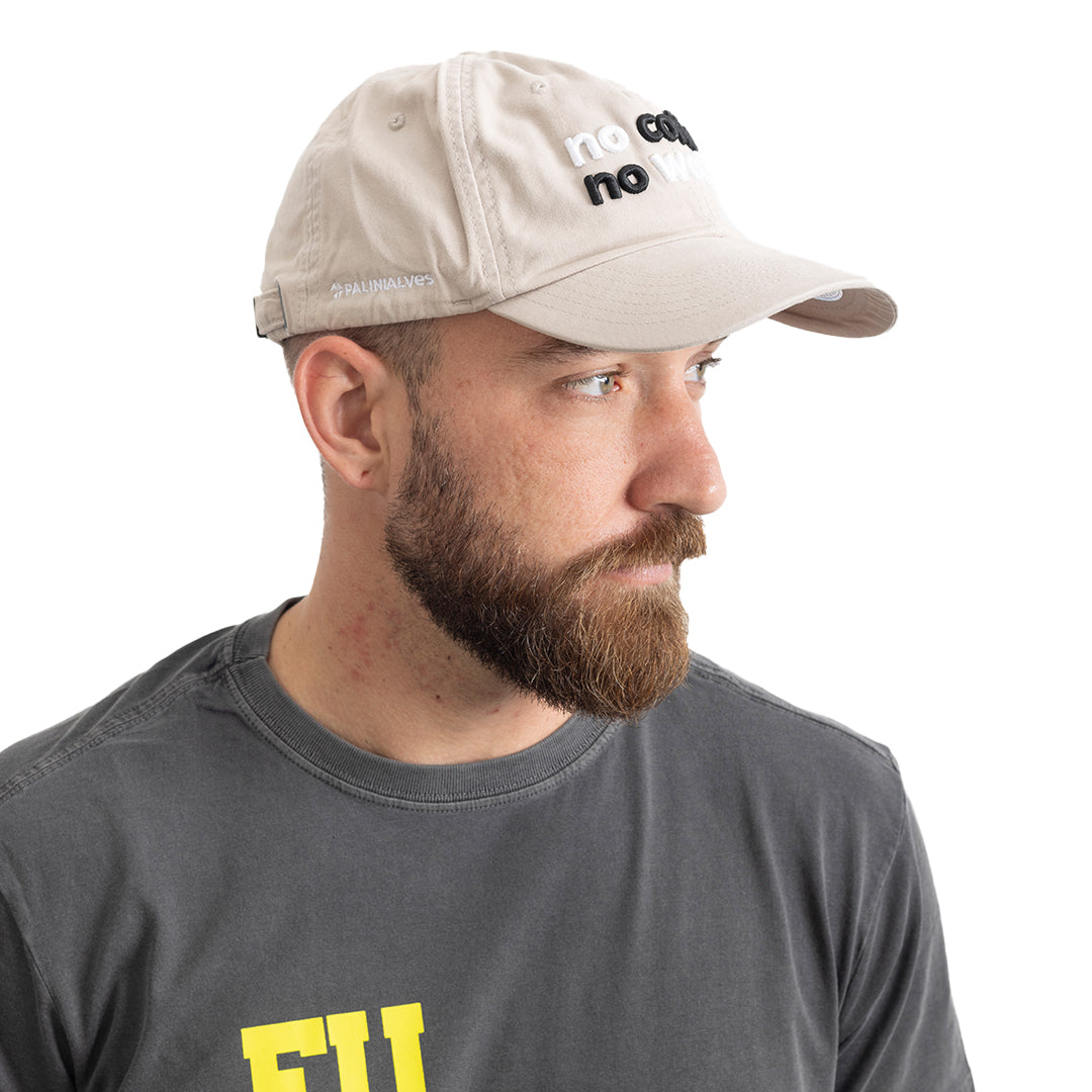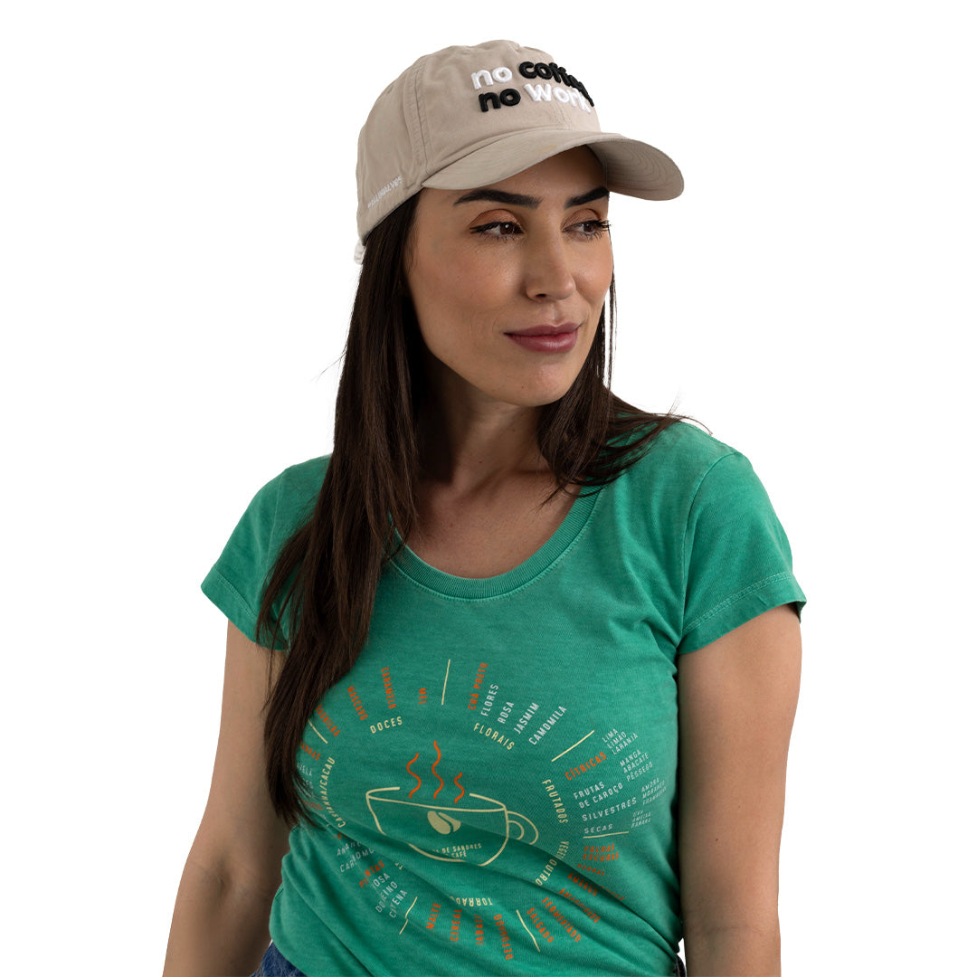 Boné fabricado em tecido, possui aba curva costurada, bordados na copa e correia de tecido para regulagem.