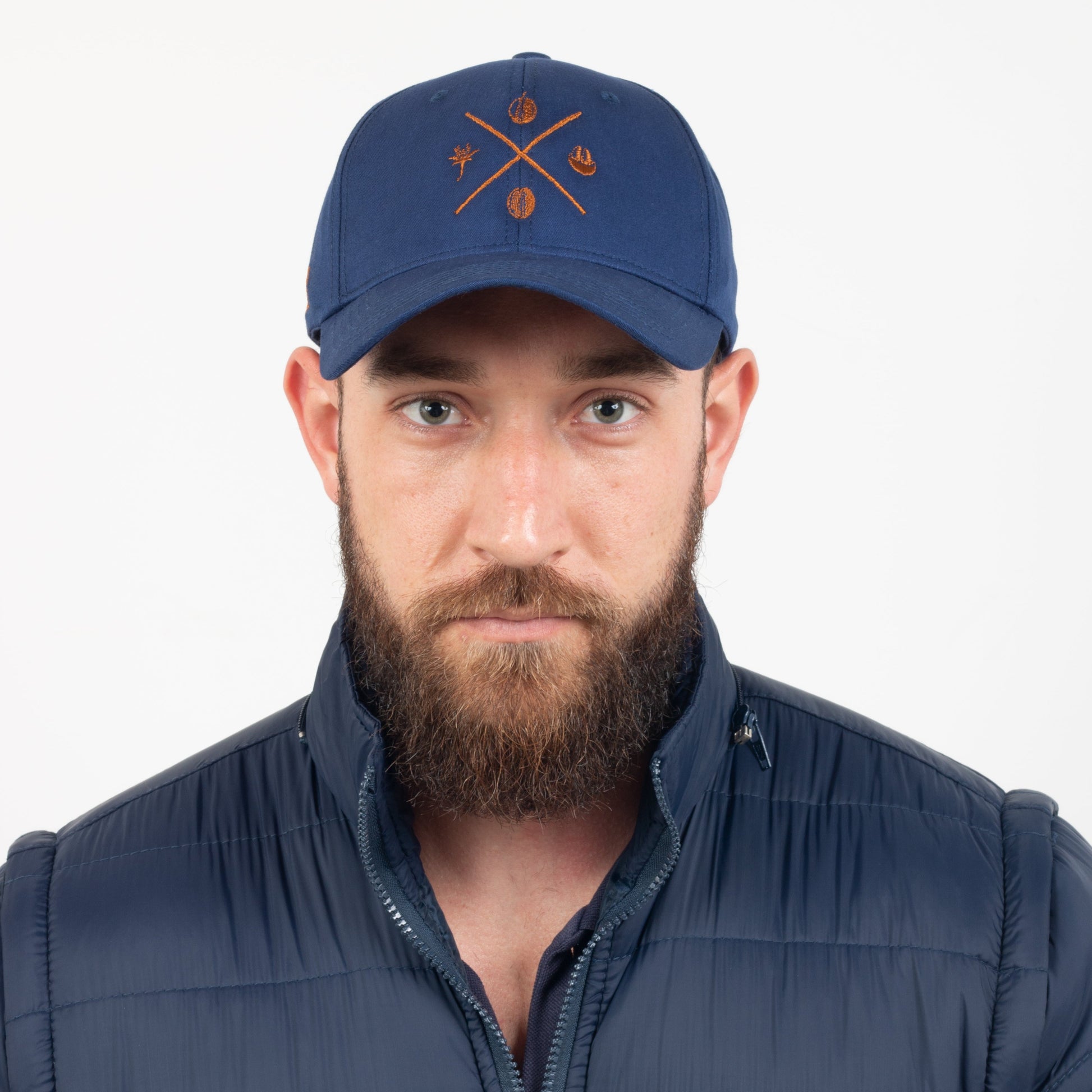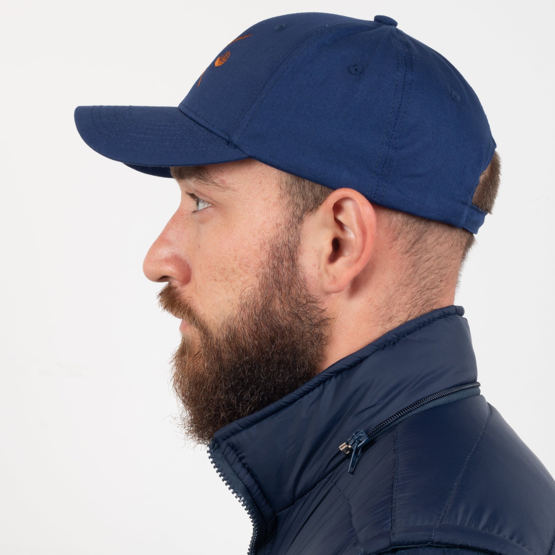 Boné fabricado em tecido, possui aba curva costurada, bordados na copa e correia de tecido para regulagem.