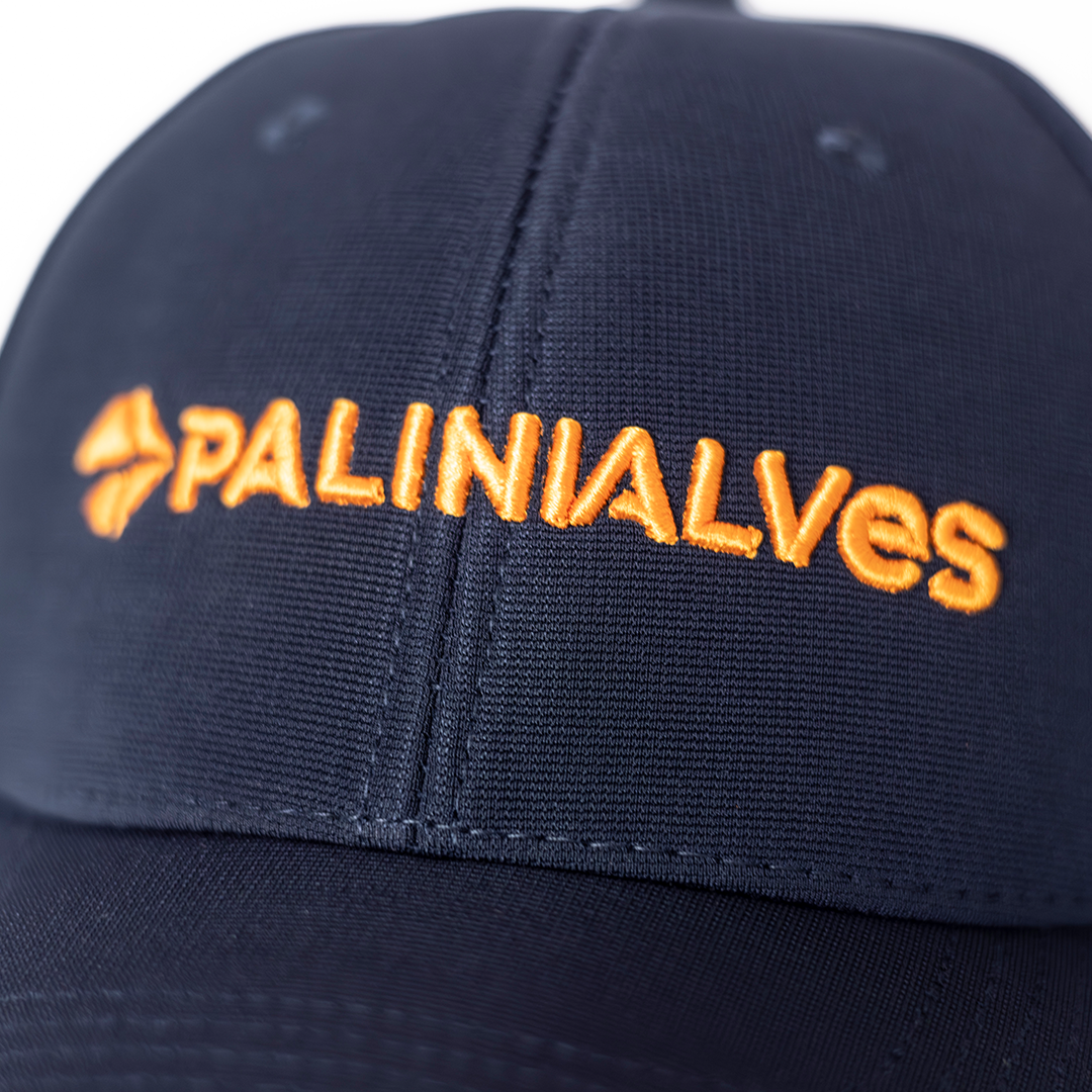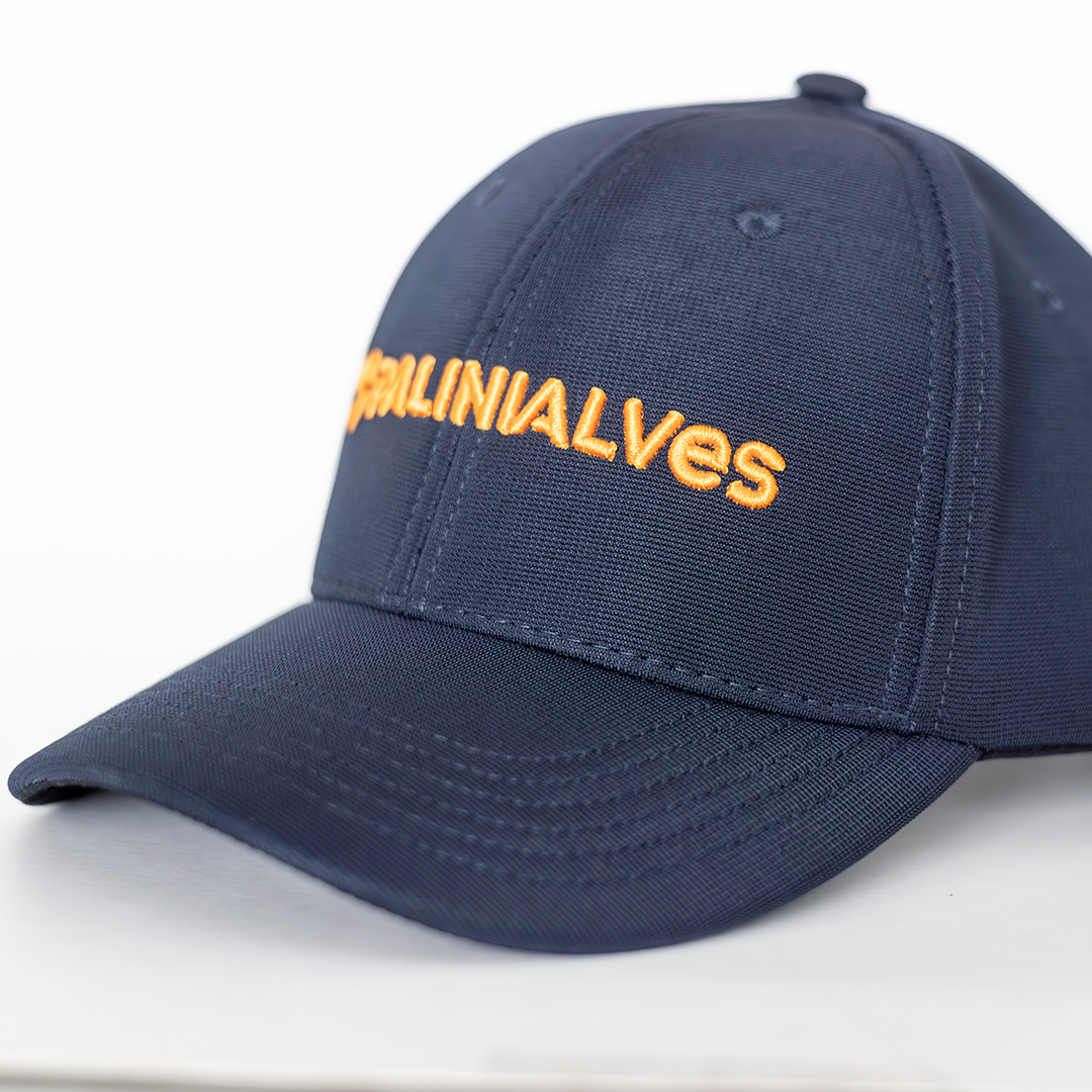 Boné fabricado em tecido, possui aba curva costurada, bordados na copa e correia de tecido para regulagem.