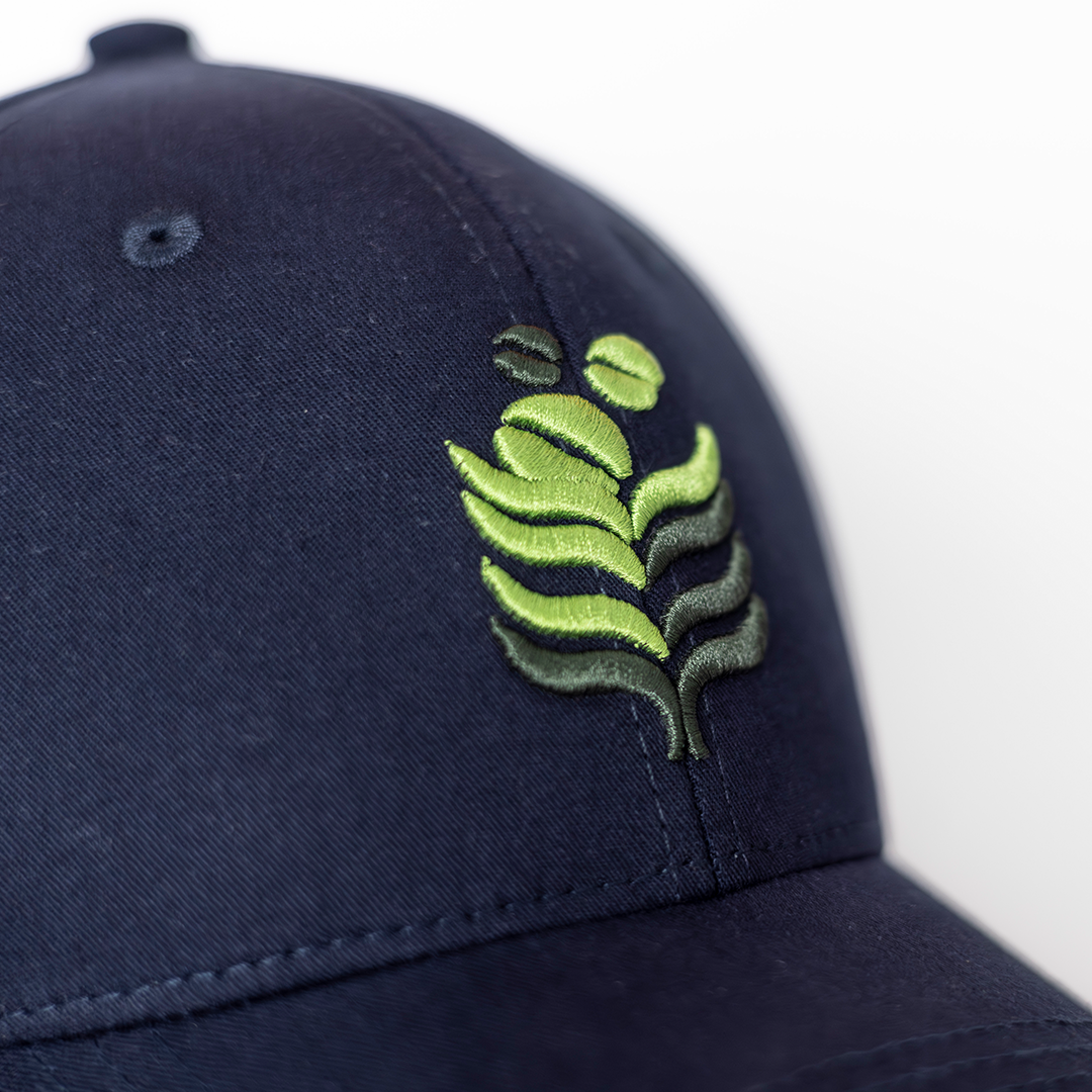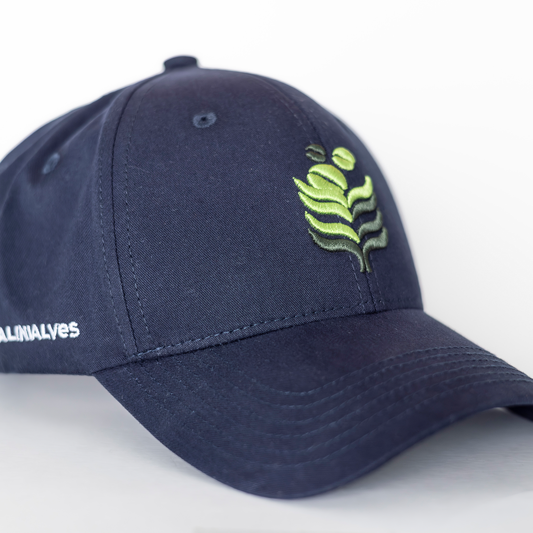 Boné fabricado em tecido na cor Azul possui aba curva costurada, bordados na copa e correia de tecido para regulagem.