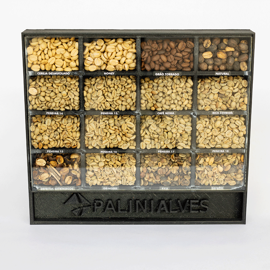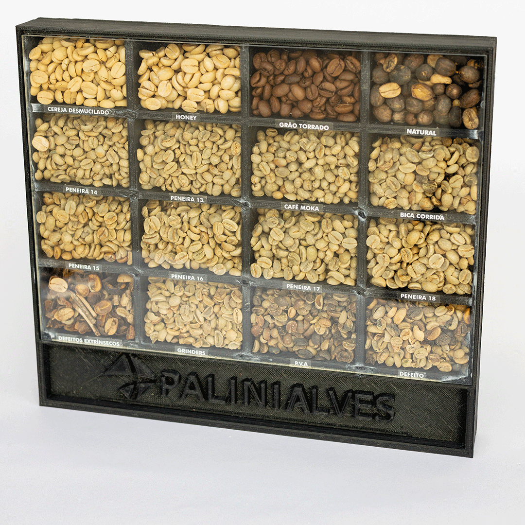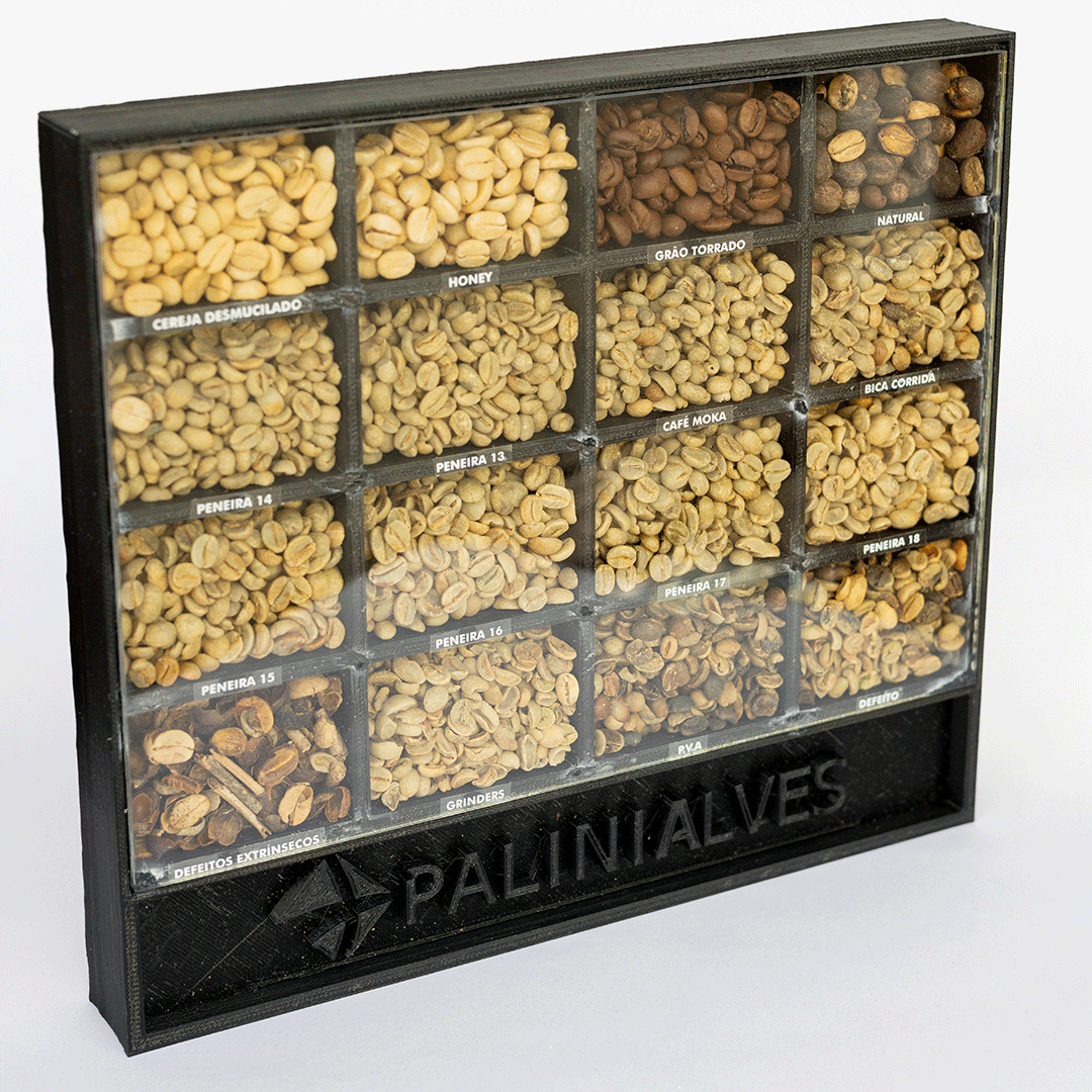 Uma caixa desenvolvida para visualização da cadeia produtiva do café, que tem 16 repartições: Cereja desmucilado, honey, grão torrado, natural, café moka, bica corrida, peneiras 14 a 18, defeitos extrínsecos e intrínseco, grinders e P.V.A.